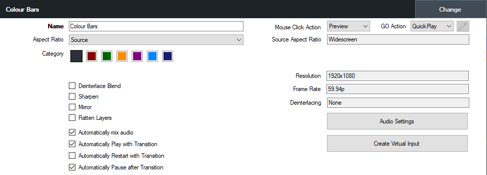 Click Change to change the source of this input while preserving all settings including colour adjustments, chroma key, position and multi view.